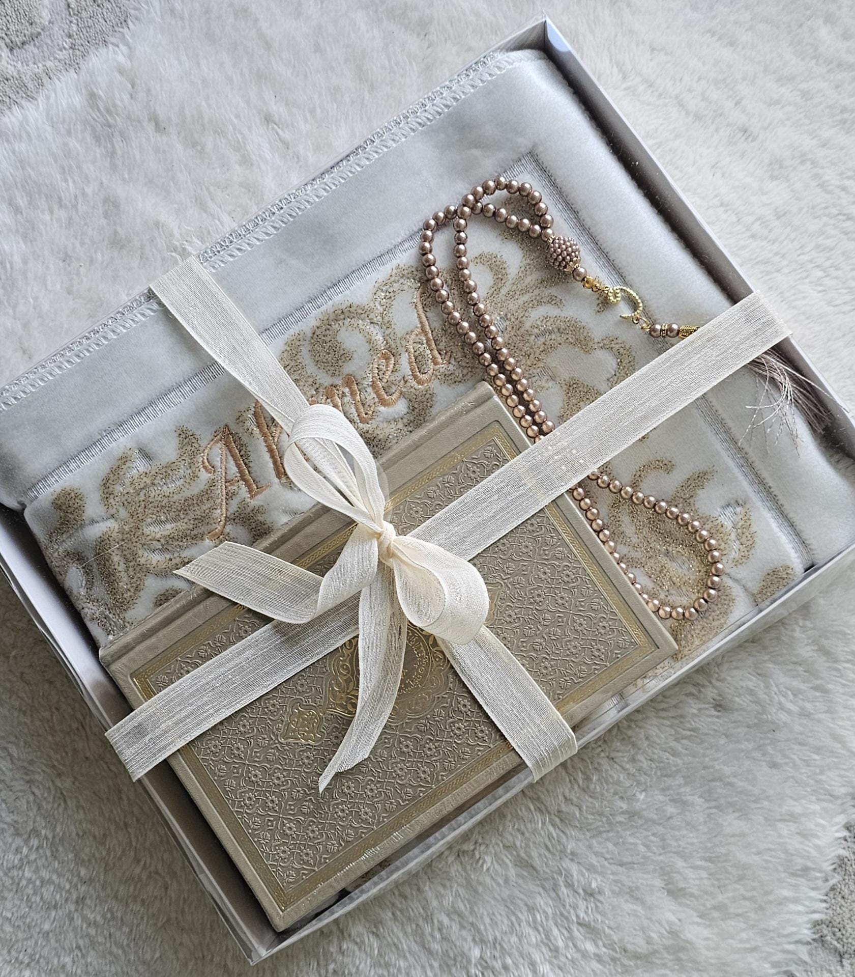 8. Customized Mat+ Tasbeh+ Quran+ Box ( Full set+ gift packed+ Quran)