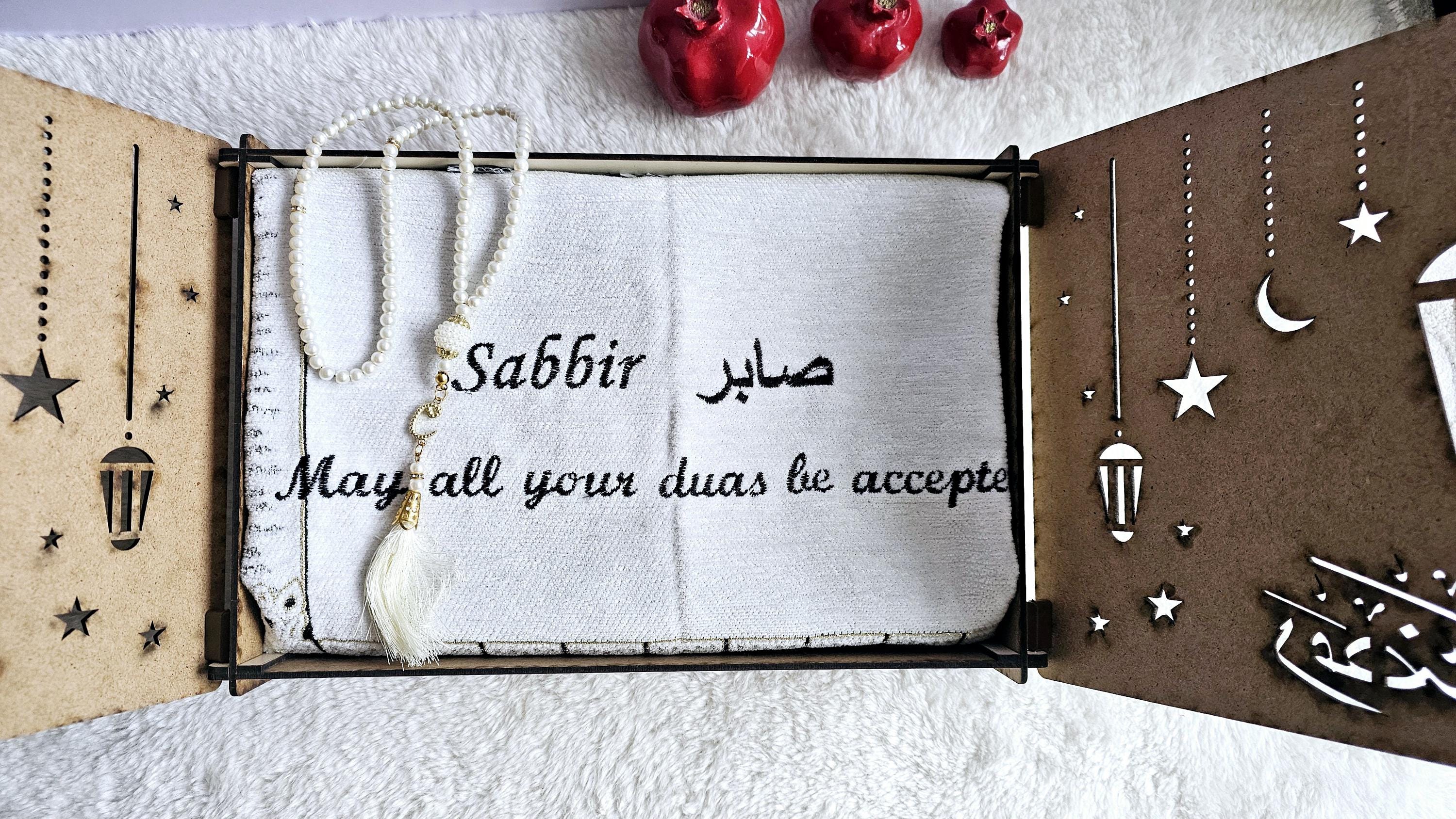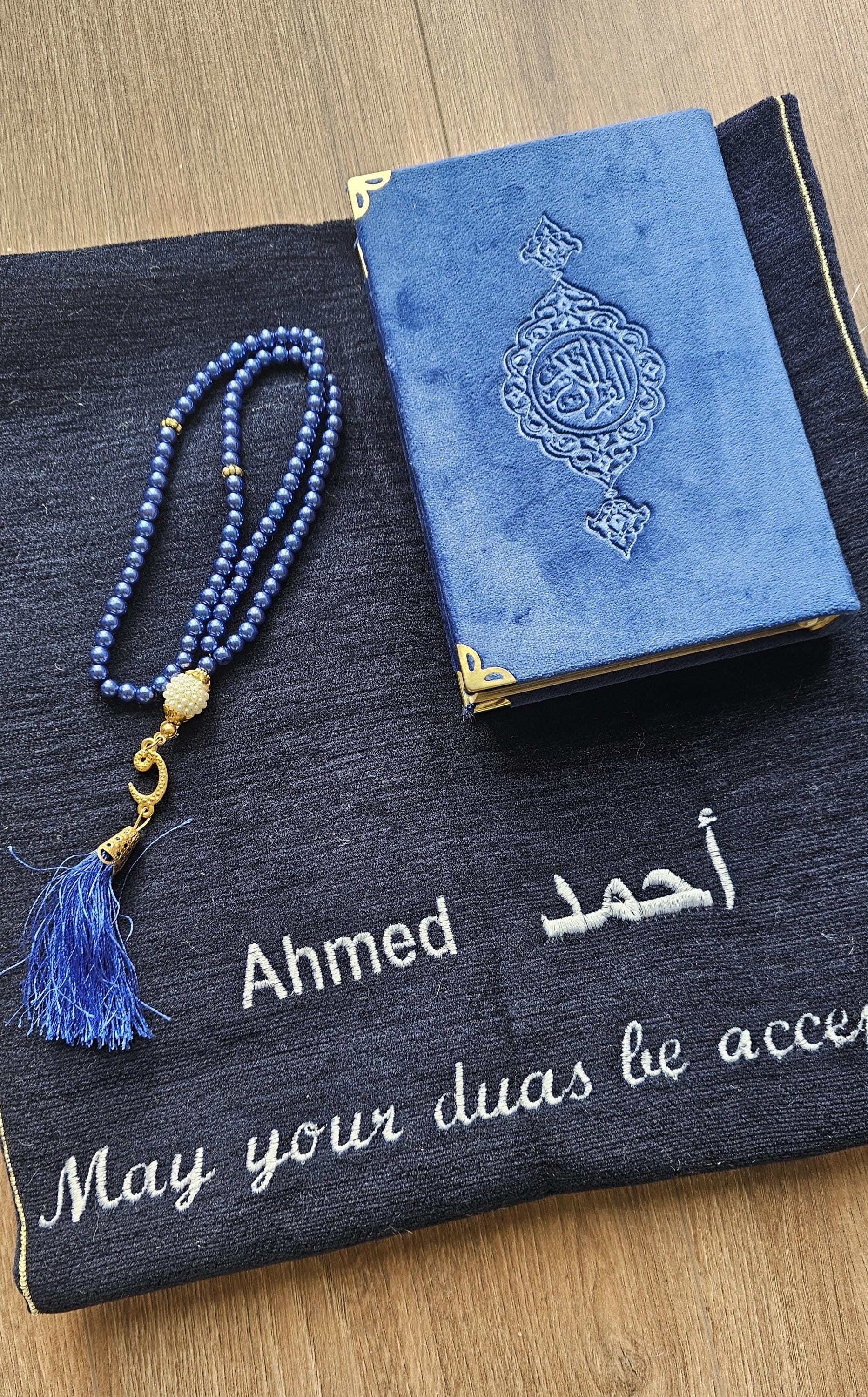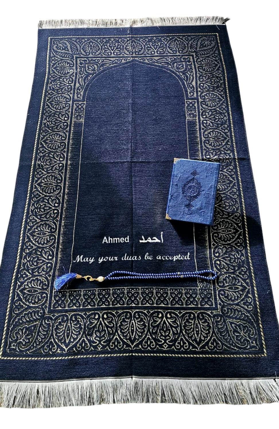 Ramadan Kareem Eid Mubarak Personalized Prayer Mat Gift Set, Customized Salah Muslim Quran Tasbeh Ameen gift, Islamic gift, Ramadan Mubarak