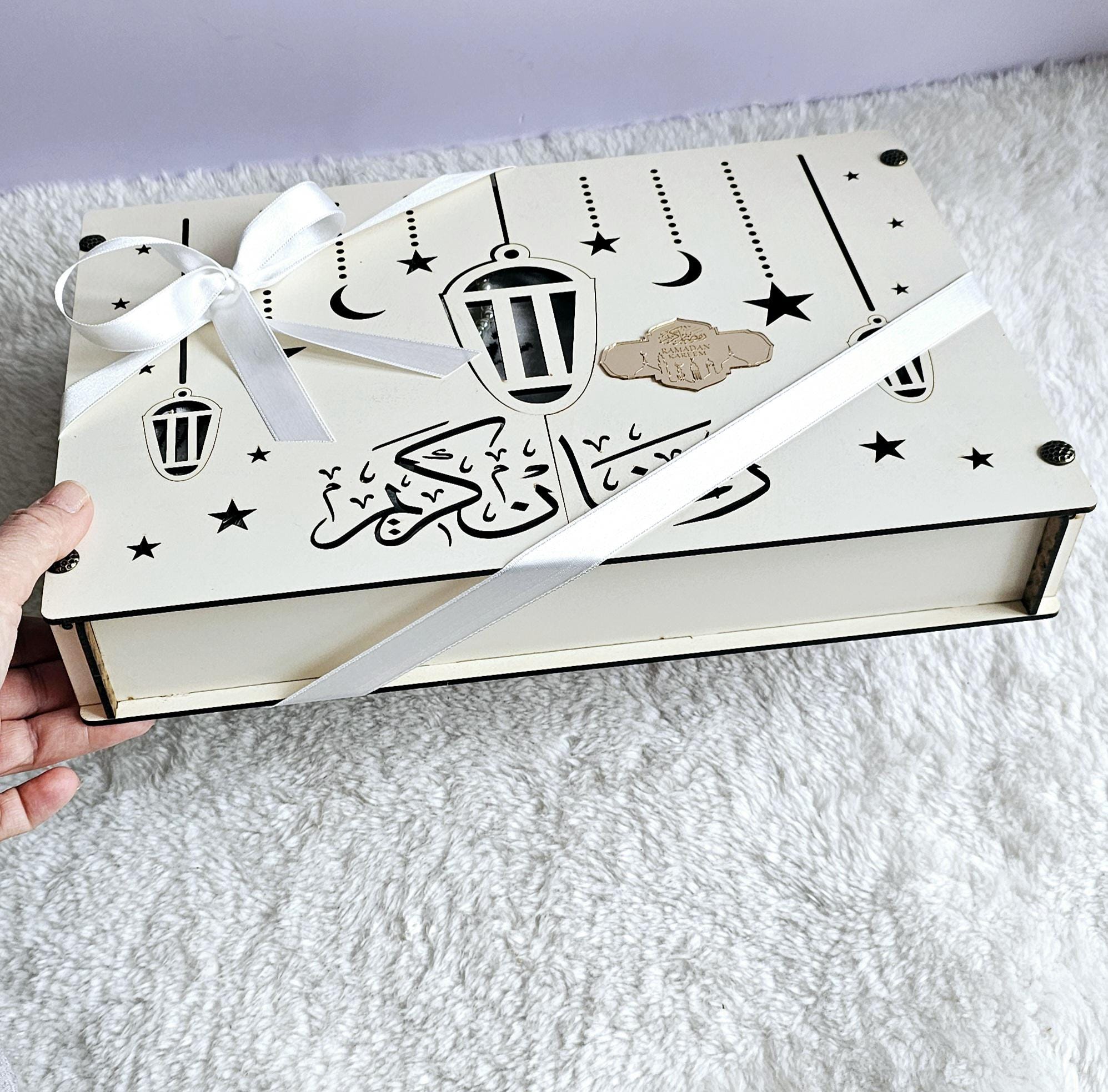 ●Wooden handmade laser cut Box has got 2 door to open.Beautiful decorated with RamadanKareem name plaque on it.