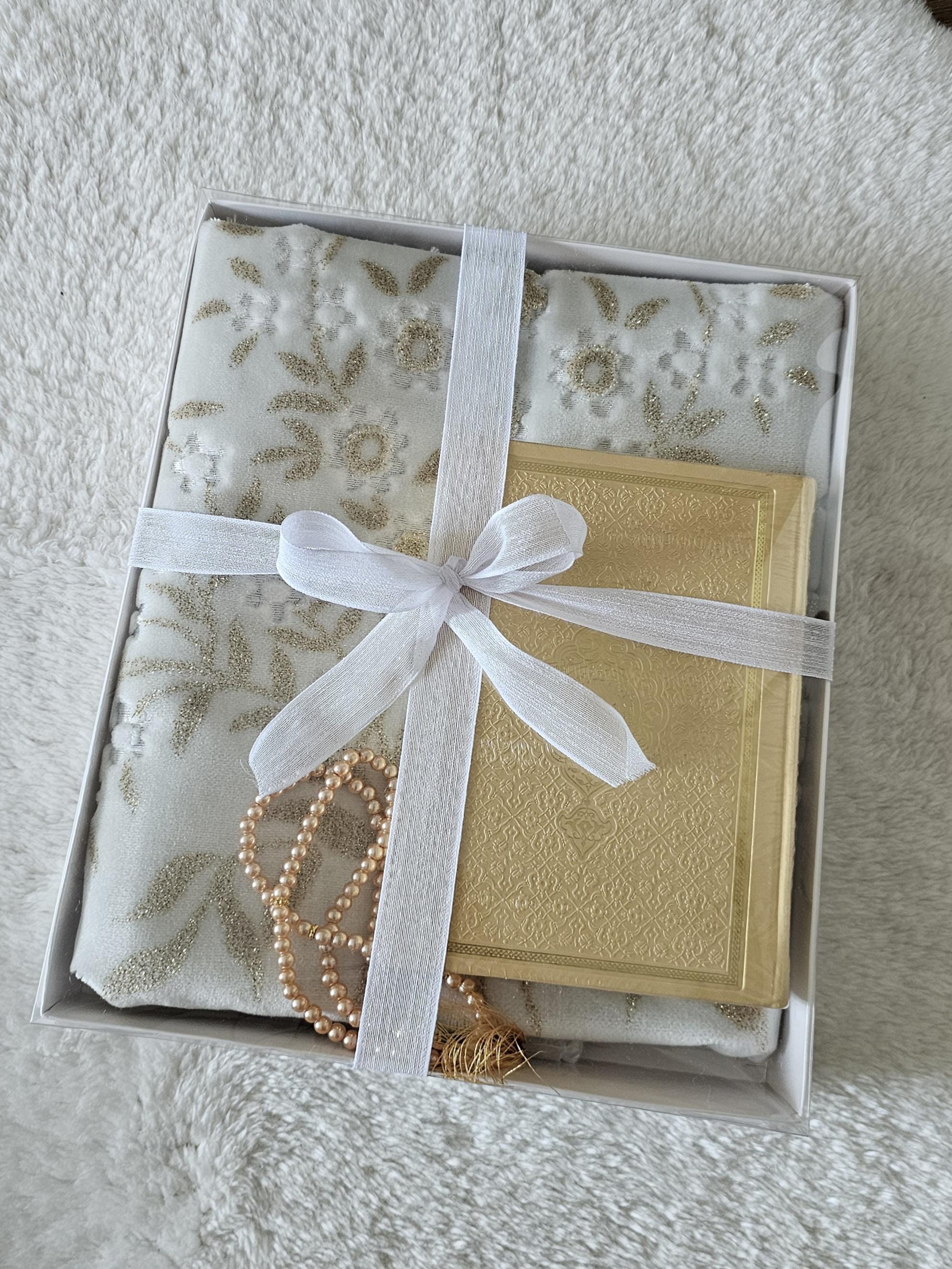 8. Customized Mat+ Tasbeh+ Quran+ Box ( Full set+ gift packed+ Quran) GOLD SET we listed.